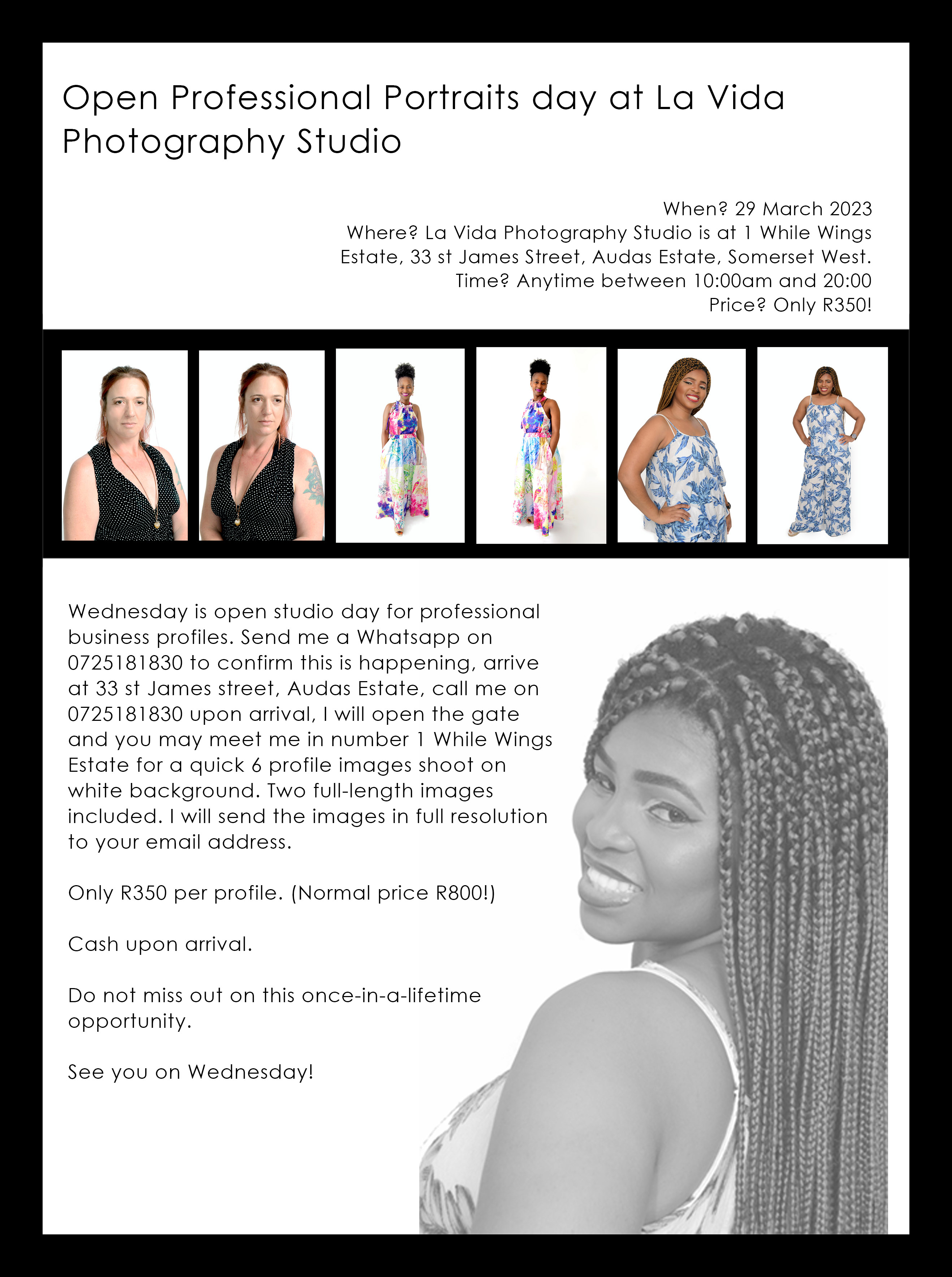 Where? La Vida Photography Studio is at 1 While Wings Estate, 33 st James Street, Audas Estate, Somerset West.